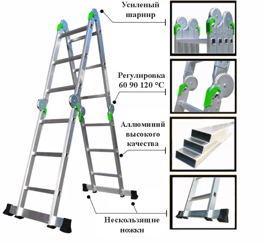 Трансформируемая лестница секционная из алюминия — это удобное и практичное решение для бытовых и хозяйственных нужд. Она состоит из четырех секций, соединенных прочными шарнирными механизмами с замками, что позволяет менять угол наклона и фиксировать нужное положение. Лестница имеет несколько форм, включая буквы "А" и "У", что делает ее многофункциональной для работы на высоте. Легкий алюминиевый корпус стойкий к коррозии и износостойкий, но при этом она подвержена деформации при сильных нагрузках. Оптимальный вариант для использования в домашних условиях, на даче или для мелких ремонтных работ.