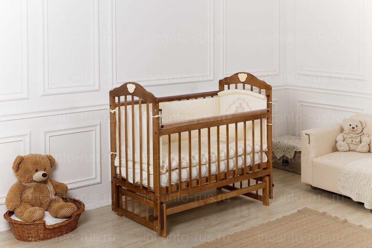 Кроваткe Incanto Pali характеризуют классический стиль, отсутствие углов и плавность очертаний. Изготовлена из массива березы произрастающей в естественных условия, экологически чистых районах России. Кроватка покрыта специальным гипоаллергенным лаком из натуральных компонентов. Кроватка оборудована самым надежным механизмом опускания боковой спинки, а силиконовая накладка защитит детские зубки. Подматрасник кровати выполнен в виде ортопедической сетки из неокрашенного бука и устанавливается в двух положениях по высоте. Верхний уровень - на расстоянии 48 см. от поднятой боковины, нижний - 64 см. Кроватка имеет опору в форме дуги, которая фиксируется колесами. Кроватку можно использовать в двух вариантах: как кроватку-качалку, или как кроватку на колесах. Для этого достаточно просто снять или поставить колеса. Роликовые опоры помогут легко перемещать кроватку на нужное место, а укачивающий механизм подарит малышу по – настоящему крепкий сон.